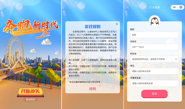 ②在页面内完善姓名、联系方式、所在区、单位、所属党支部(温馨提示:各支部名称请规范书写哦)等信息后参与游戏。游戏分为单人竞速赛、双人PK赛、四人PK赛三大类,其中双人、四人PK赛将随机为参赛者匹配对手进行比赛。