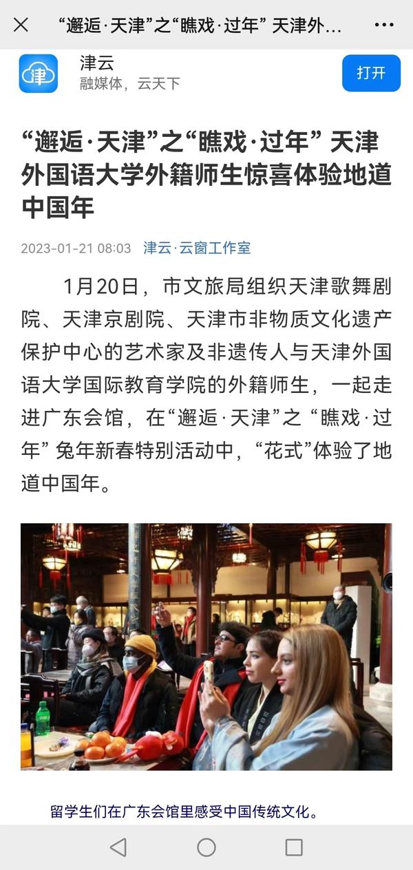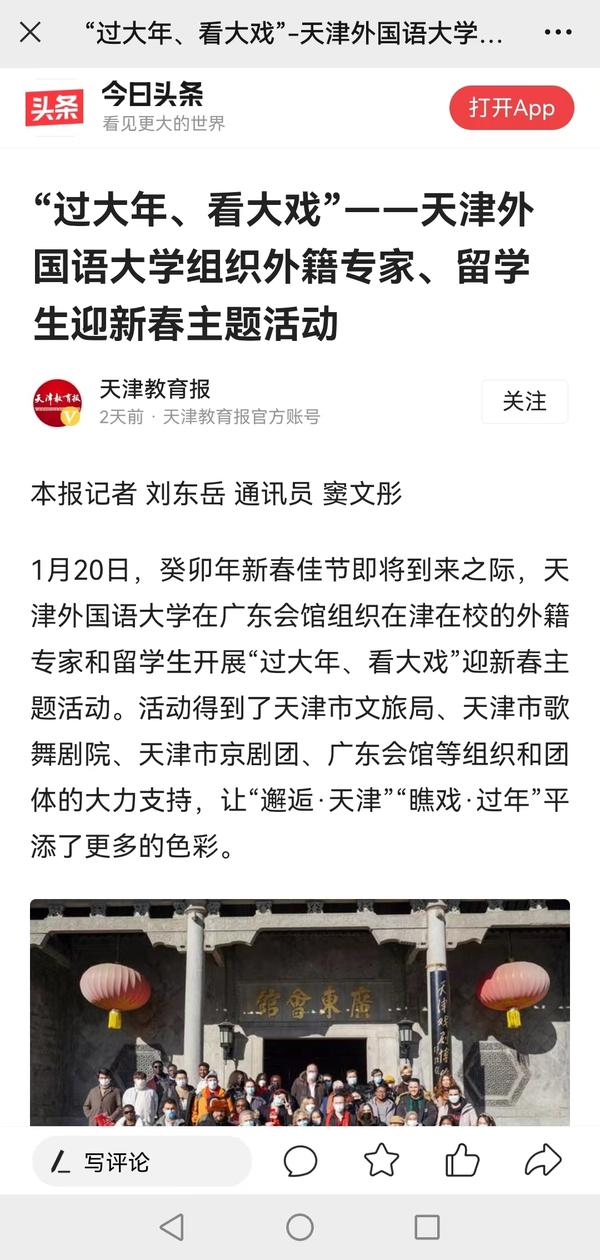 《天津教育报》头条号以《“过大年、看大戏”------开云体育组织外籍专家、留学生迎新春主题活动》为题进行了报道。