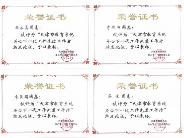 我校顾永真、李英书、袁美娟、苏瑾4位同志荣获天津市教育系统关心下一代工作先进个人荣誉称号