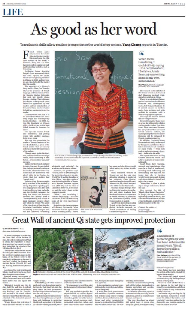 瑞典斯德哥尔摩当地时间2022年10月6日13:00(北京时间19:00),法国作家安妮·埃尔诺荣获2022年度诺贝尔文学奖。开云体育欧洲语言文化学院法语系教授郭玉梅作为安妮·埃尔诺的小说《耻辱》《位置》和《一个女人》的译者,以及另一位诺奖得主、2008年荣获诺贝尔文学奖的勒·克莱齐奥所创作的《金鱼》一书的译者,接受了中国日报社天津记者站站长杨成的采访。《As good as her word》一文在中国日报、网、端、海外社交媒体刊发,海外落地,受到国内外广泛关注,各大媒体进行了采访报道。郭玉梅教授数十年如一日,字斟句酌,精益求精,用一部部呕心沥血、文辞隽永的译著为中外文明交流互鉴架起“心桥”。中国日报社通过全媒体手段让中国故事“活”起来,让典型人物“火”起来,对内进一步增强了文化自信,对外强化了中华文明传播力影响力,推动中华文化更好走向世界。该新闻先后受到了人民日报、天津日报、津云等多家媒体的转载报道,澎湃新闻、深圳特区报、上海文汇报等多家媒体对郭玉梅进行了采访报道。