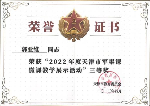 日前,在天津市教委和天津警备区战备建设局联合举办的2022年度天津市军事课微课教学展示活动比赛中,我校国际传媒学院辅导员郭亚维在军事课微课教学展示(普通高等学校组)竞赛中获得三等奖。