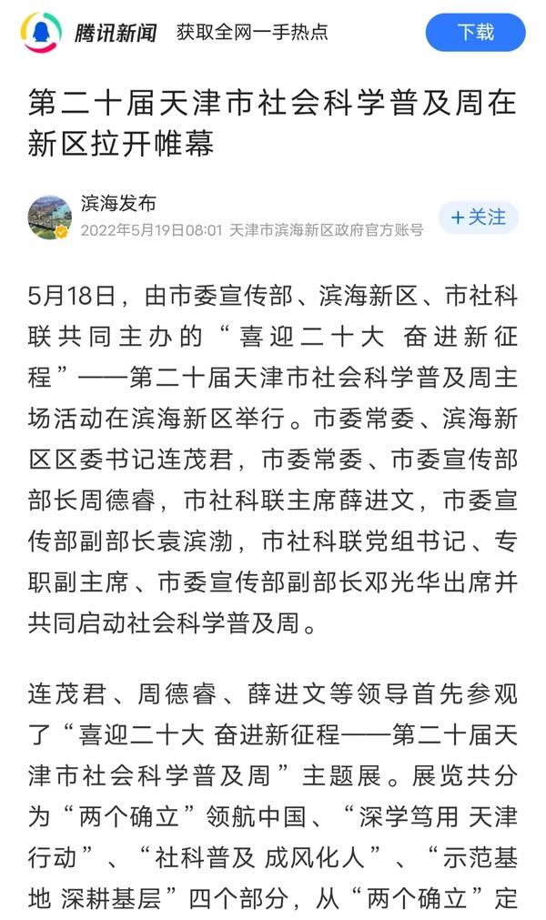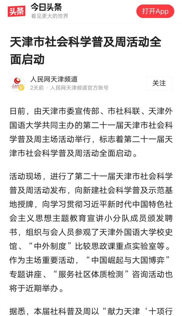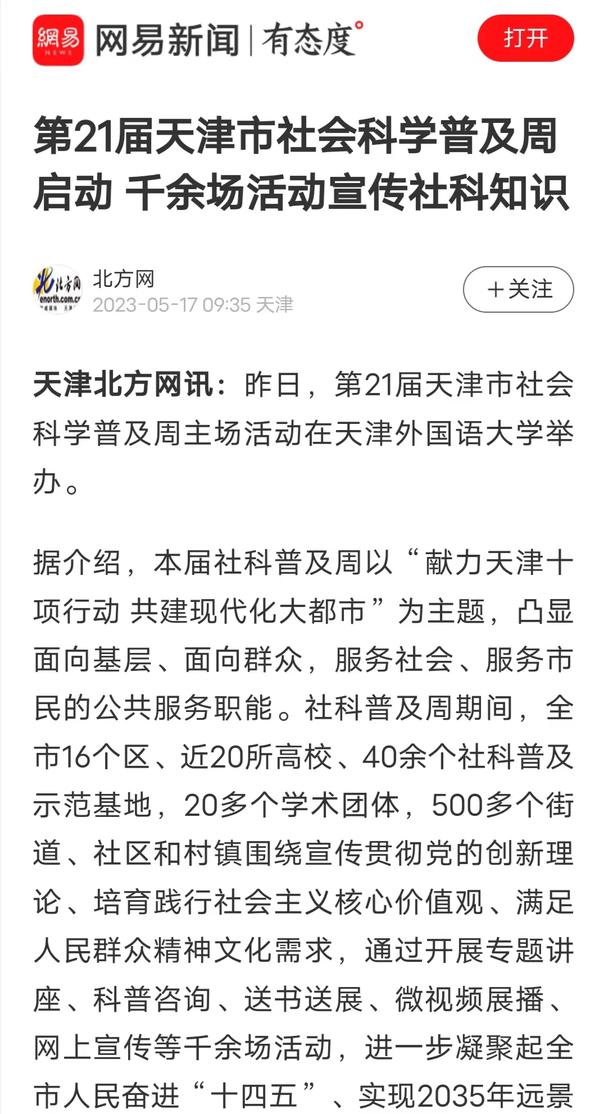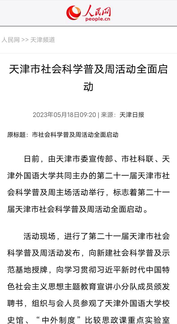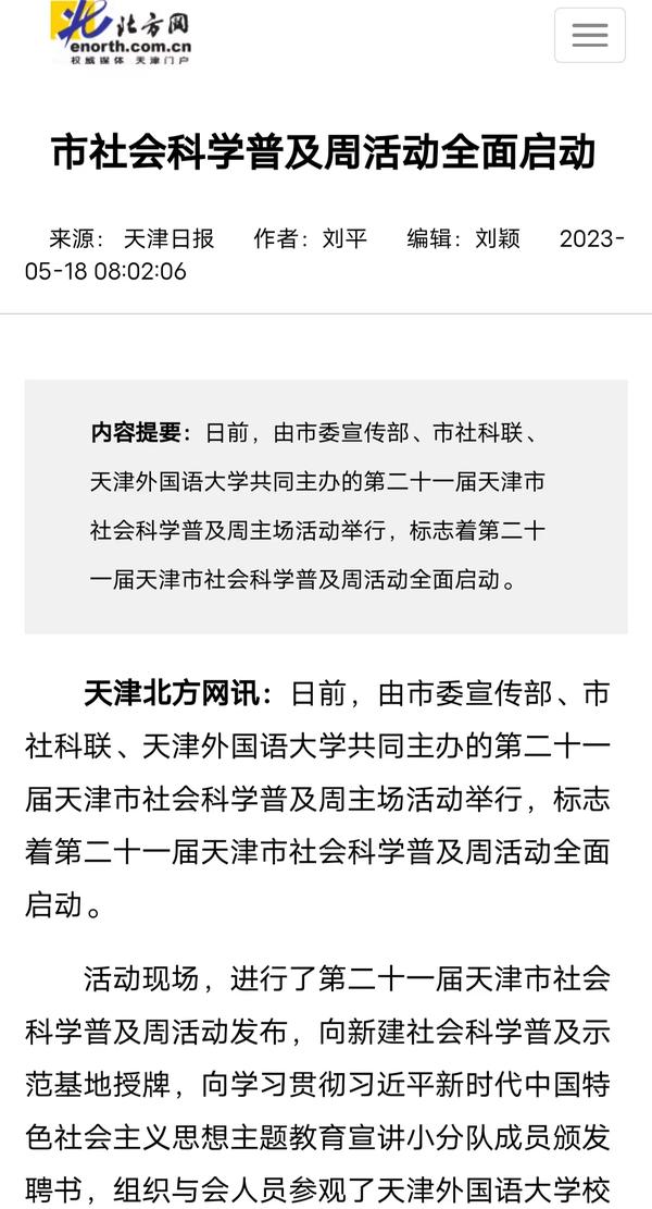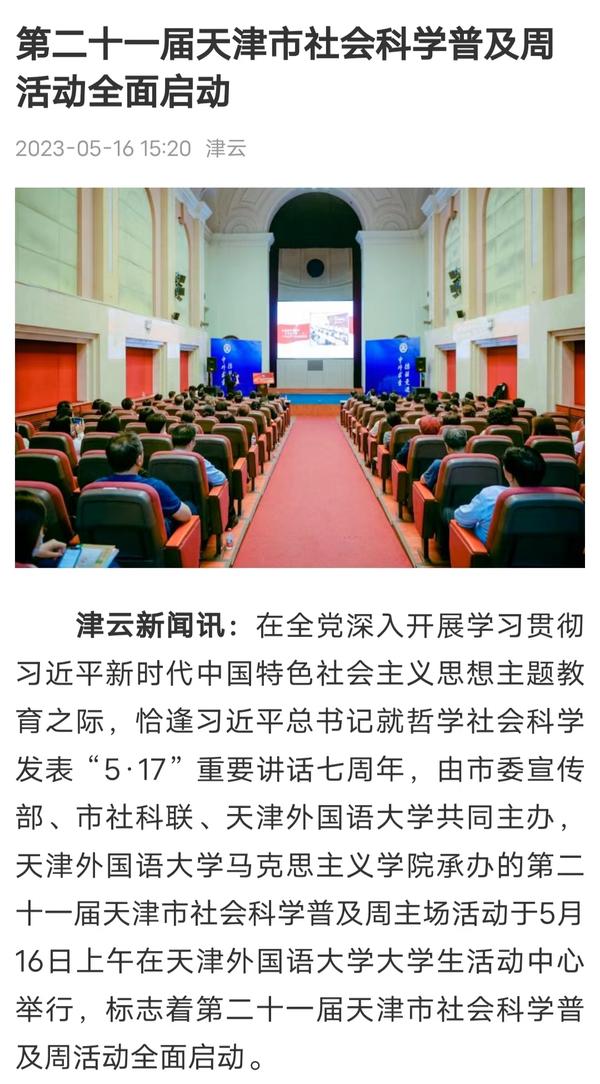 5月16日,由天津市委宣传部、市社科联、开云体育共同主办的第二十一届天津市社会科学普及周主场活动在我校成功举行,标志着第二十一届天津市社会科学普及周活动全面启动。人民网、人民网天津频道头条号、天津日报、津云、北方网、网易新闻、搜狐新闻、腾讯新闻等多家媒体对此进行了报道。