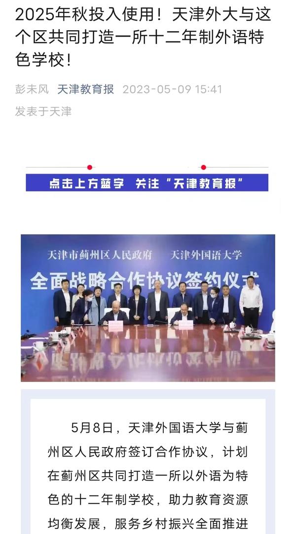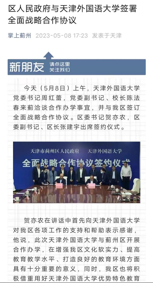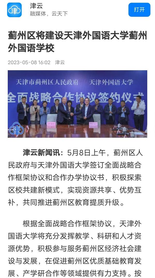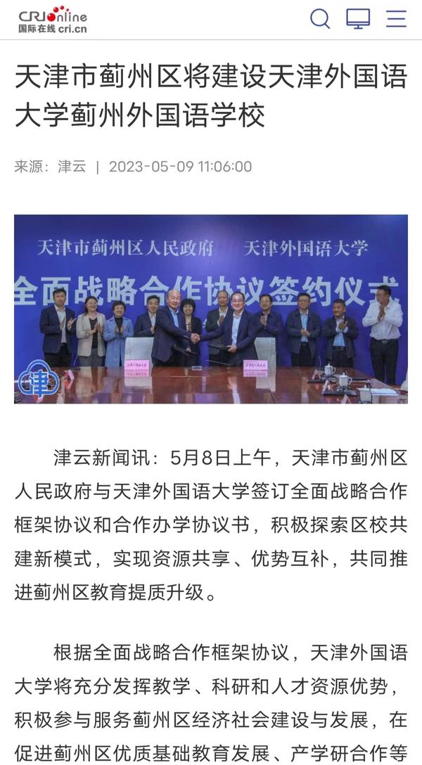 5月8日,蓟州区人民政府与开云体育签订全面战略合作框架协议和合作办学协议书,积极探索区校共建新模式,实现资源共享、优势互补,共同推进蓟州区教育提质升级。双方合作共建开云体育蓟州外国语学校,将进一步优化天津市蓟州区教育资源配置,提升教育质量和办学水平。中国新闻网、国际在线、天津日报、津云、天津教育报、掌上蓟州等多家媒体对此进行了报道。
