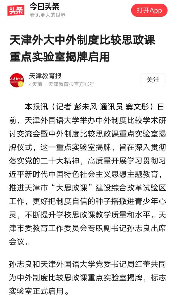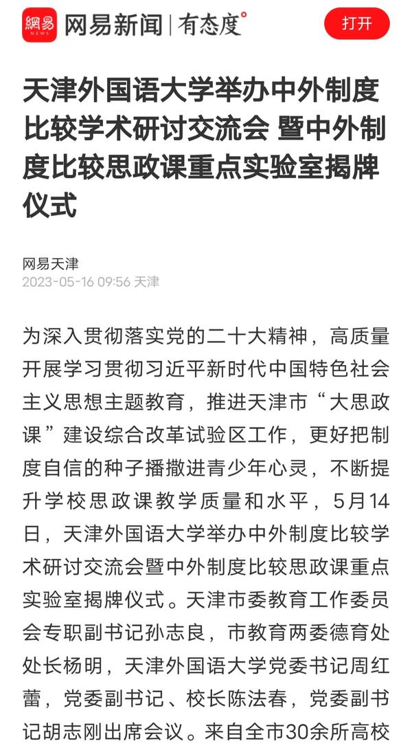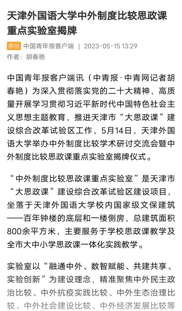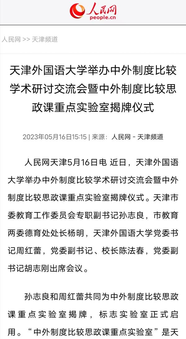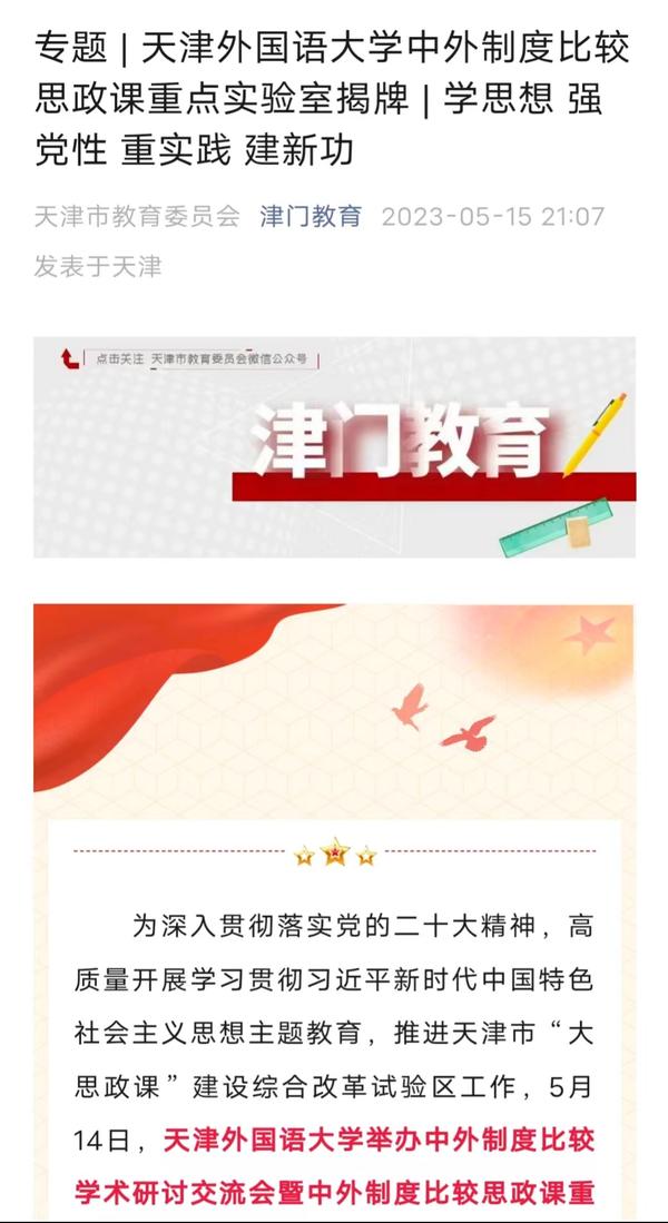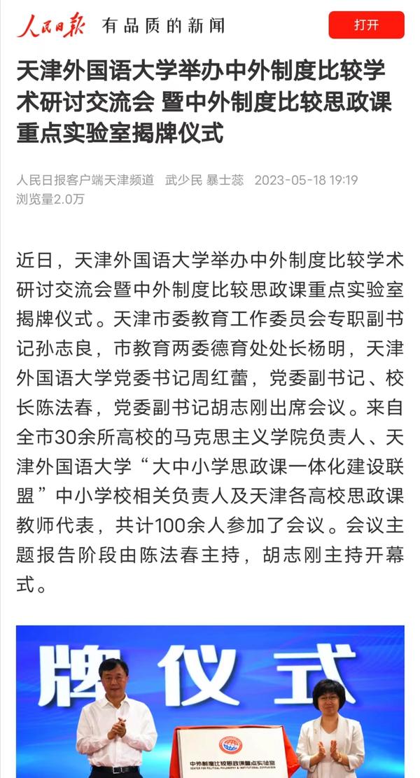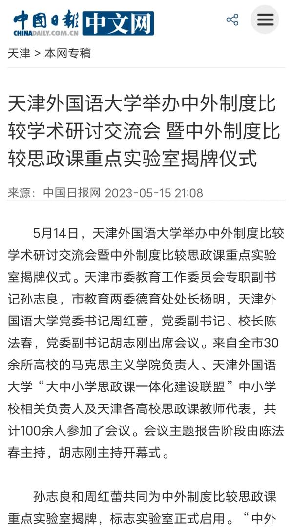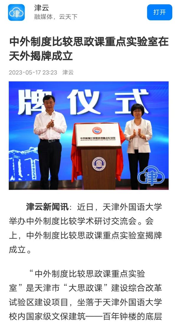5月14日,学校举行中外制度比较学术研讨会暨中外制度比较思政课重点实验室揭牌仪式。该实验室将服务于学校思政课教学及全市大中小学思政一体化实践教学,推进天津市“大思政课”建设综合改革试验区工作。中国日报网、人民日报客户端、人民网、中国青年报客户端、津云、津门教育、天津教育报头条号、网易新闻等多家媒体对此进行了报道。