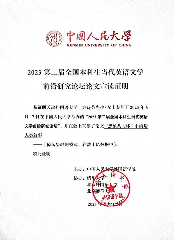 6月17日,由中国人民大学外国语学院主办,清华大学外文系比较文学与文化研究中心、北京外国语大学英语学院、北京师范大学外国语言文学学院英语系协办的“2023第二届全国本科生当代英语文学前沿研究学术论坛”成功举办。受邀参会的本领域专家学者作主旨发言。我校英语学院文化系2020级方诗芸和刘雅楠两位同学,同来自全国的100余名本科生一起,在各自分论坛宣读了学术论文。