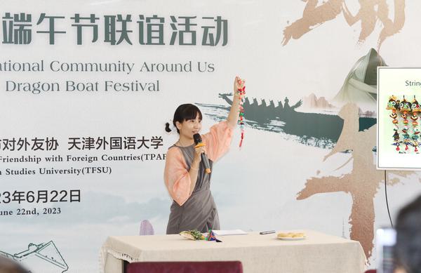 刘怡蔓表示,端午节作为中国人民对以爱国诗人屈原为代表的爱国先驱表达缅怀之情、崇敬之意的传统节日,凝聚着我们的民族精神和情感,是中华民族文化遗产的重要组成部分,也是展示和传播优秀民族文化的重要载体。当前,在全市上下积极筹备世界经济论坛第十四届新领军者年会暨2023天津夏季达沃斯论坛之时,特意邀请“身边的国际社会”习汉礼、学汉语、包粽子、挂香袋,中西文化合璧交融。希望大家通过此次活动,进一步深入了解中国传统节日的深刻内蕴,近距离感受中华民族传统文化的无限魅力。
