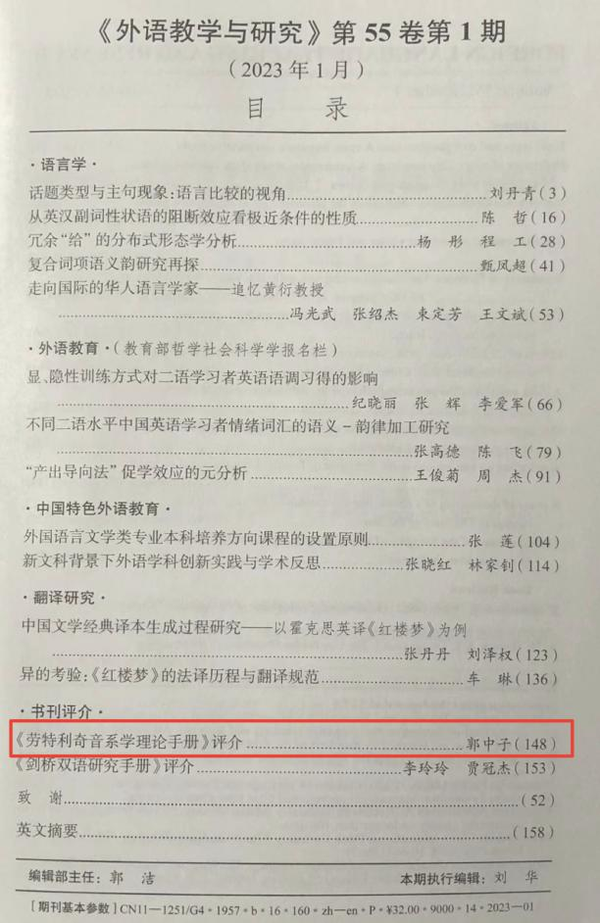 书评《〈劳特利奇音系学理论手册〉评介》系作者主持的教育部人文社会科学研究规划基金项目“音系------句法的交互与英汉韵律结构对比研究”(20YJA740016)的阶段性成果,发表于《外语教学与研究》2023年第1期,该刊为CSSCI来源期刊,ISSN号为1000-0429。
