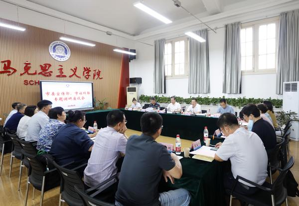 为深入开展学习贯彻习近平新时代中国特色社会主义思想主题教育,推动有关工作进一步走深走实,6月19日,市委宣传部理论处(市社科工作办)处长(主任)王庆杰,市社科联智库工作部部长江立云,市委宣传部理论处(市社科工作办)干部张龙飞、周凤雅,市教育两委宣传处干部胡海桃一行到我校调研。副校长余江主持调研座谈会。