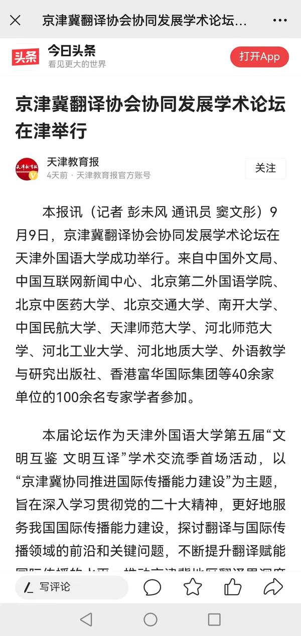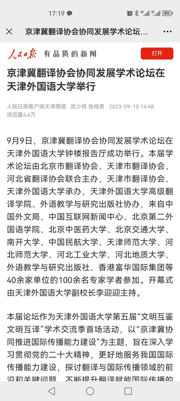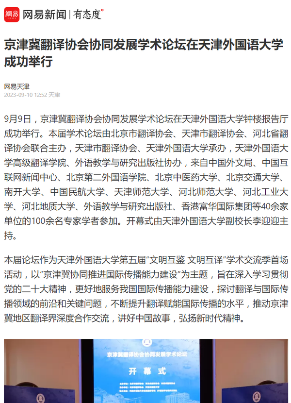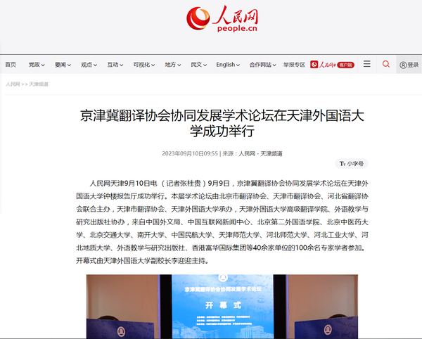 9月9日,京津冀翻译协会协同发展学术论坛在我校举行,来自中国外文局、中国互联网新闻中心等40余家单位的100余名专家学者参加。作为学校第五届“文明互鉴 文明互译”学术交流季首场活动,本届论坛以“京津冀协同推进国际传播能力建设”为主题,探讨翻译与国际传播领域的前沿和关键问题,不断提升翻译赋能国际传播的水平,推动京津冀地区翻译界深度合作交流。人民日报、人民日报客户端、人民网、新华社客户端、中新网、中国日报网、津云客户端、《天津教育报》、天津教育报头条号、网易新闻等多家中央及天津市媒体对此进行了报道。