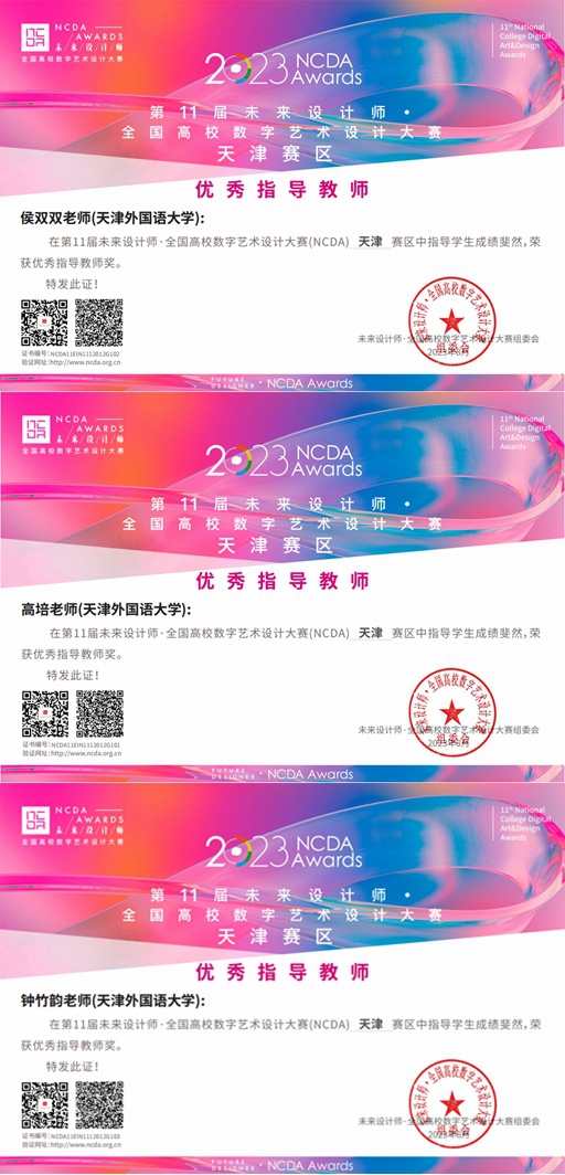 近日,2023年第十一届未来设计师·全国高校数字艺术设计大赛(NCDA)落下帷幕,我校国际传媒学院动画艺术系学子喜获该赛事天津赛区一等奖3项、二等奖3项、三等奖4项,共计10项省级荣誉。侯双双、高培、钟竹韵老师获优秀指导教师奖。以下为参赛项目获奖名单: 获奖名单