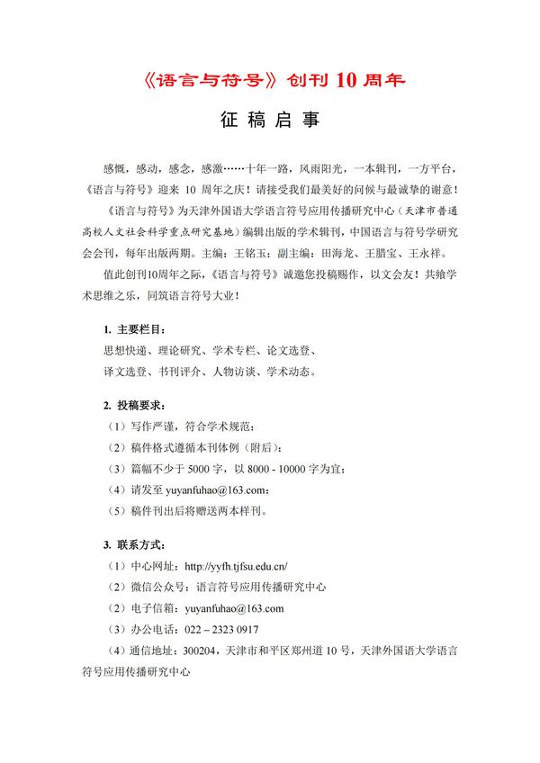十年磨一剑,梅香苦寒来。2023年,在各级领导关注与支持下,历经多年持续不懈努力,由开云体育语言符号应用传播研究中心(天津市人文社会科学重点研究基地)编辑出版的中国语言与符号学研究会会刊------《语言与符号》,迎来创刊10周年之庆!
