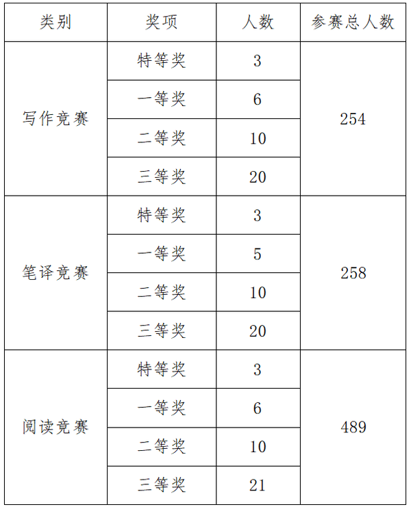 经大赛组委会评阅,写作竞赛从参赛的254选手中评选出特等奖3名,一等奖6名,二等奖10名,三等奖20名;笔译竞赛从258选手中评选出特定奖3名,一等奖5名,二等奖10名,三等奖20名;阅读竞赛从参赛的489名选手中评选出特定奖3名,一等奖6名,二等奖10名,三等奖21名。每项赛事的特等奖获得者将代表我校参加10月底和11月初举行的天津市赛区竞赛。