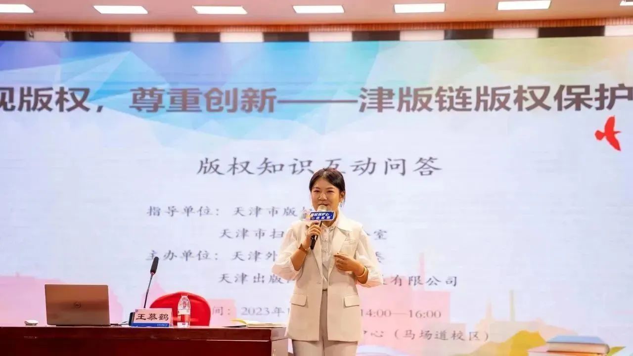 本次活动设立了现场互动环节,天津出版国际文化发展有限公司版权中心主任王慕鹤就“重视版权,尊重创新”的主题进行互动问答,充分调动了大家学习版权知识的热情。学生周卉表示:“希望学校能够举办更多与版权相关的讲座和培训活动,这样大家可以了解更多的版权知识,也能在日常生活中逐渐树立起版权保护意识。”