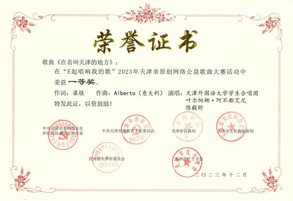 1月22日,“相遇津彩·点赞天津”2023年中国(天津)网络文化节暨总结表彰会在天津市委网信办三楼会议厅举行。活动主办单位负责同志,各区、各部门、各单位网信办负责同志和网络媒体、网络大V、好网民代表,以及文化节各项目主办、承办、主创单位负责人出席。我校中外师生原创作品《在名叫天津的地方》荣获“E起唱响我的歌”2023天津市原创网络公益歌曲大赛一等奖。会后,作品曲作者、我校意大利语专业外籍教师Alberto接受了媒体采访。