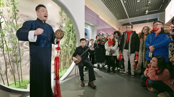 当天在展厅里,来自天津歌舞剧院的民乐演员们为外籍师生们带来了民乐表演《春江花月夜》,天津市曲艺团著名青年艺术家王鸿亮表演了单弦岔曲《风雨归舟》,天津市青年京剧团的演员们带来昆曲《牡丹亭》片段,委婉细腻、流丽悠长的唱腔,载歌载舞、衣袂飘飘的表演,典雅考究、华丽优美的唱词让师生们沉浸式体验了中国戏曲之美。现场的表演艺术家和非遗传承人们也表示,很高兴能为外籍师生们展示中华文化的博大精深,让他们感受独特的东方美学。
