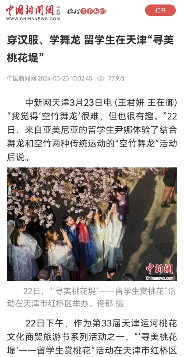 春分好时节,我校携手红桥区委宣传部、文旅局,举办百名留学生“寻美桃花堤”活动,带领留学生穿汉服、赏桃花、品非遗,感受春日美景和中华优秀传统文化的魅力。新华社客户端、中国新闻网、央广网、中国日报网、天津新闻频道-都市报道60分、“TJTV新闻频道”视频号、天津日报、津云、今晚报、“你好天津”视频号、“美丽红桥”视频号等多家媒体和单位对此进行了报道。