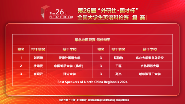 我校学子与来自北京大学、清华大学、中国人民大学、南开大学、北京外国语大学等知名院校的选手同台竞技,用扎实的语言功底、缜密的思辨能力、娴熟的辩论技巧以及流畅的口头表达,以队伍总积分11分,辩手得分767分的优异成绩,荣获华北赛区一等奖,夺得国赛入场券。其中,刘钰琦以个人得分385的高分斩获本场比赛最佳辩手。
