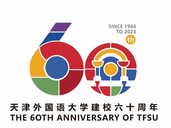 标识图案由红、黄、蓝、绿、紫五色渐变而成,整体协调饱满、色彩多元,象征着多元文化、多彩世界。数字“6”,形似浪花,朵朵汇聚,奔涌向前,既代表着学校坐落于美丽的渤海之滨天津,又象征着无数天外学子如“后浪”一般奔腾入海;数字“0”,宛若游龙,环绕校徽,向心汇聚,灵感来源于中华传统文化中龙形玉玦的神态。圆形校徽,以地球为背景,经纬交织,中间为学校标志性建筑------钟楼的造型。校庆标识承载了天外融通中外、走向世界、面向未来的信念,彰显了学校始终致力于用多种语言展示世界多元文化,用多元文化推动中外文明交流互鉴的使命和担当。