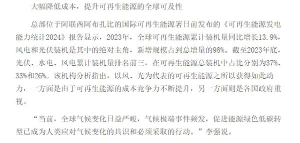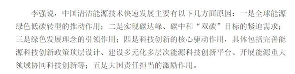 “当前,全球气候变化日益严峻,气候极端事件频发,促进能源绿色低碳转型已成为人类应对气候变化的共识和必须采取的行动。”李强说,“中国清洁能源技术快速发展主要有以下几方面原因:一是全球能源绿色低碳转型的推动作用;二是实现碳达峰、碳中和“双碳”目标的紧迫需求;三是绿色发展理念的引领作用;四是科技创新的核心驱动作用,具体包括完善能源科技创新政策顶层设计、建设多元化多层次能源科技创新平台、开展能源重大领域协同科技创新等;五是大国责任担当的激励作用。”