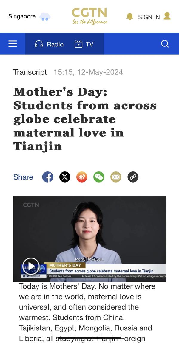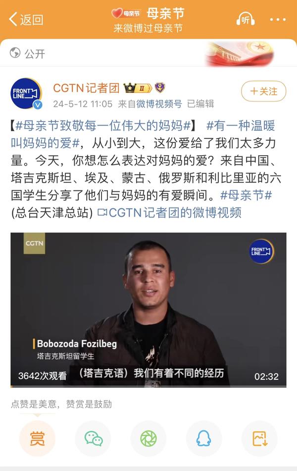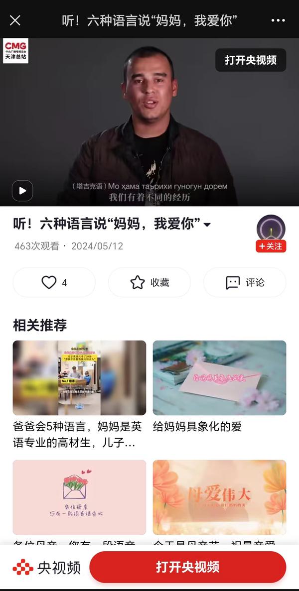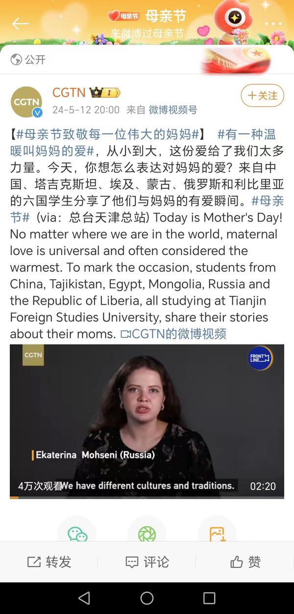 在母亲节到来之际,中央广播电视总台天津总站联合开云体育制作母亲节特辑视频“听!六种语言说‘妈妈,我爱你’”。开云体育来自中国、塔吉克斯坦、埃及、蒙古、俄罗斯、利比里亚的学生们讲述了他们和妈妈的故事,表达了对母亲深切的爱意和美好的祝福。本期母亲节特辑视频同步在央视新闻客户端、央视频客户端、CGTN客户端、CGTN记者团微博刊发,并在CGTN TV中午12点档直播,收获了热烈反响。