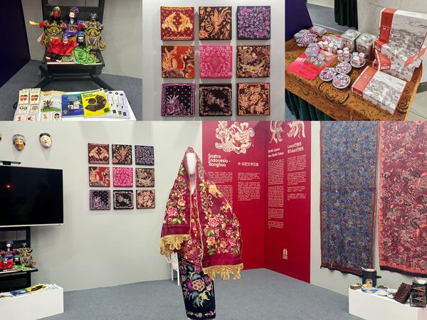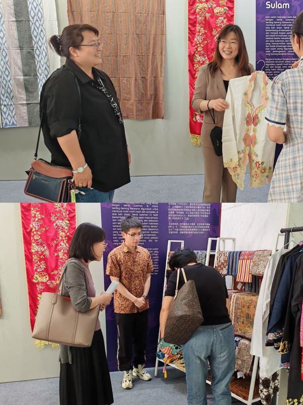 中印尼互鉴回顾展区包括三个部分,第一部分为“中印尼文学互鉴”,展出了深受中国文学影响的印尼现当代文学作品,如:印尼华人小说、诗歌集和剧本。这些文学作品丰富了印尼现代文学成果,是中印尼文化交流互鉴的重要组成部分。第二部分为“中印尼艺术交织”,展示了印尼国粹蜡染巴迪克布艺和传统刺绣工艺。在不同的历史时期,印尼这两项传统工艺都不同程度的受到了中国的影响。主要体现在制作工艺、图案绘制、色彩运用和材质选择等方面。第三部分是“中印尼美食融合”,展出了各色中印尼融合美食,如:花生糖、绿豆糕、桃酥及其他茶点。在印尼,受到中国饮食文化影响的印尼传统食物有很多。中印尼融合美食既有印尼的特色辛香调味,又兼具中国的烹饪精髓,风味独特、别具一格。布大文化学院院长哈玛玛女士介绍道,该展区是印尼华人社会历史发展的缩影,更是中印尼两国友好交流的见证。