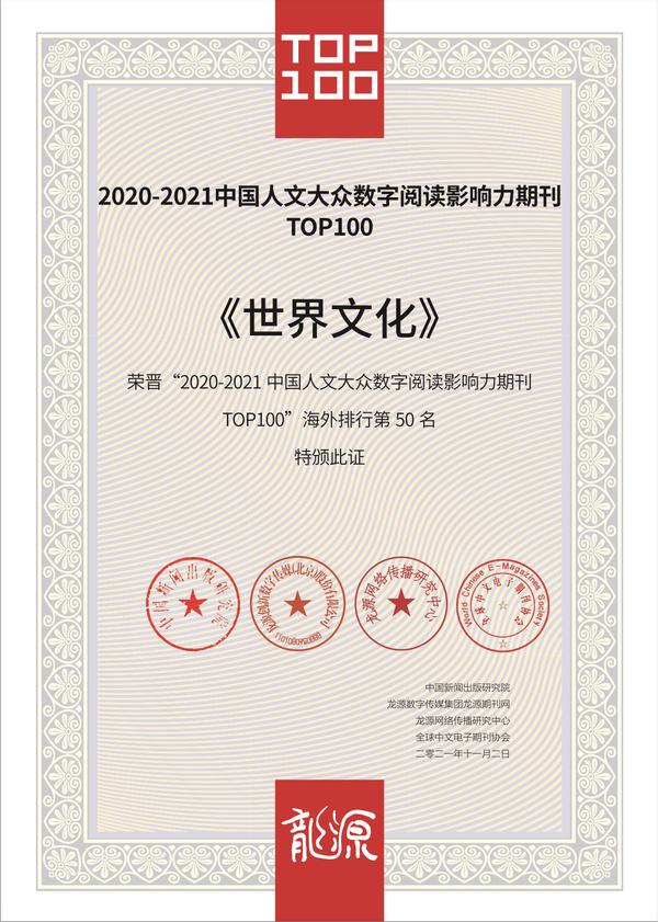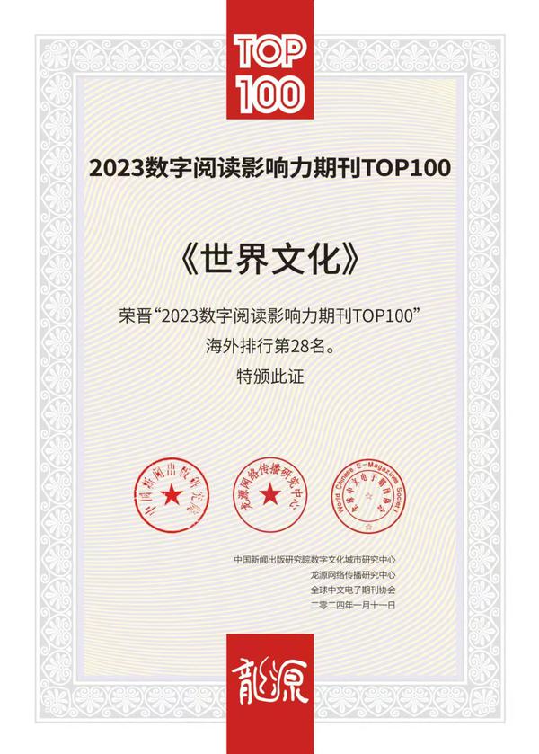 ------力推数字转型,拓展传播渠道。在当前出版产业转型升级及出版深度融合的时代背景下,刊物积极应对传播环境变化,推动传统媒体与新兴媒体融合发展,不断扩大在数字平台的传播力与影响力。在全力打造“《世界文化》微信公众号”的同时,还与中国知网、万方、维普、龙源、超星等多家知名数字媒体展开业务合作,且被《读者》《青年文摘》等名刊长期关注并选载收录。2021-2023年,在中国新闻出版研究院和龙源数字传媒集团联合发布的“中国人文大众数字阅读影响力期刊TOP100”海外排行榜中,《世界文化》连续三年荣晋前50名,也是榜单前50名中唯一由高校主办的文化综合类期刊,其中最高年阅读量达115万。