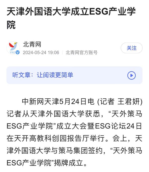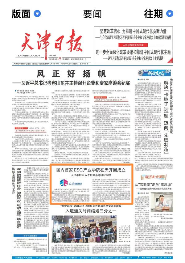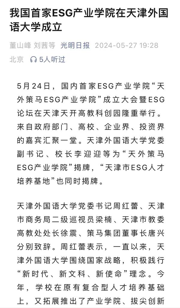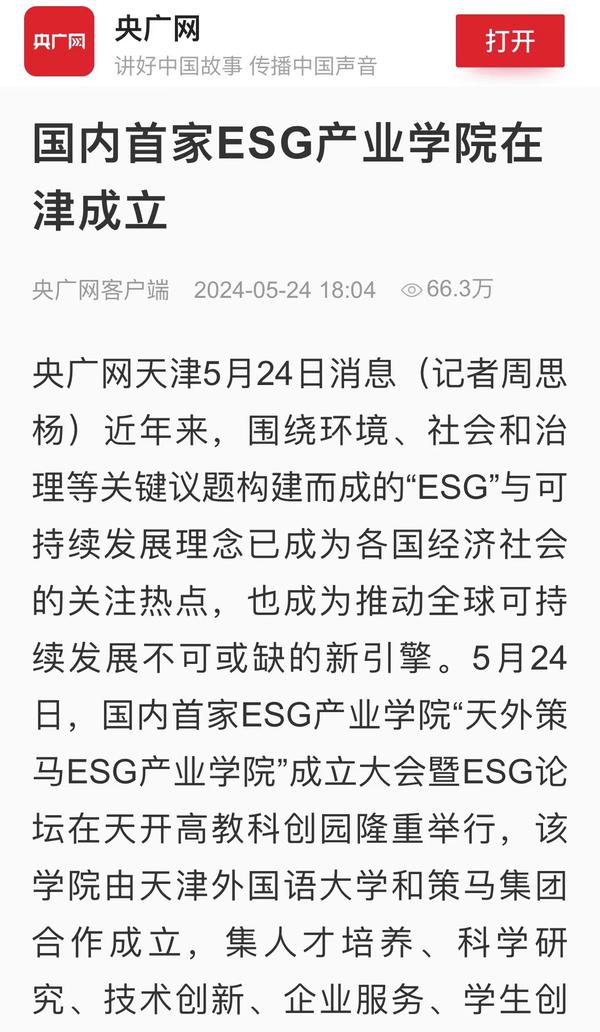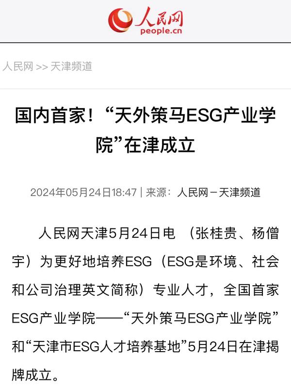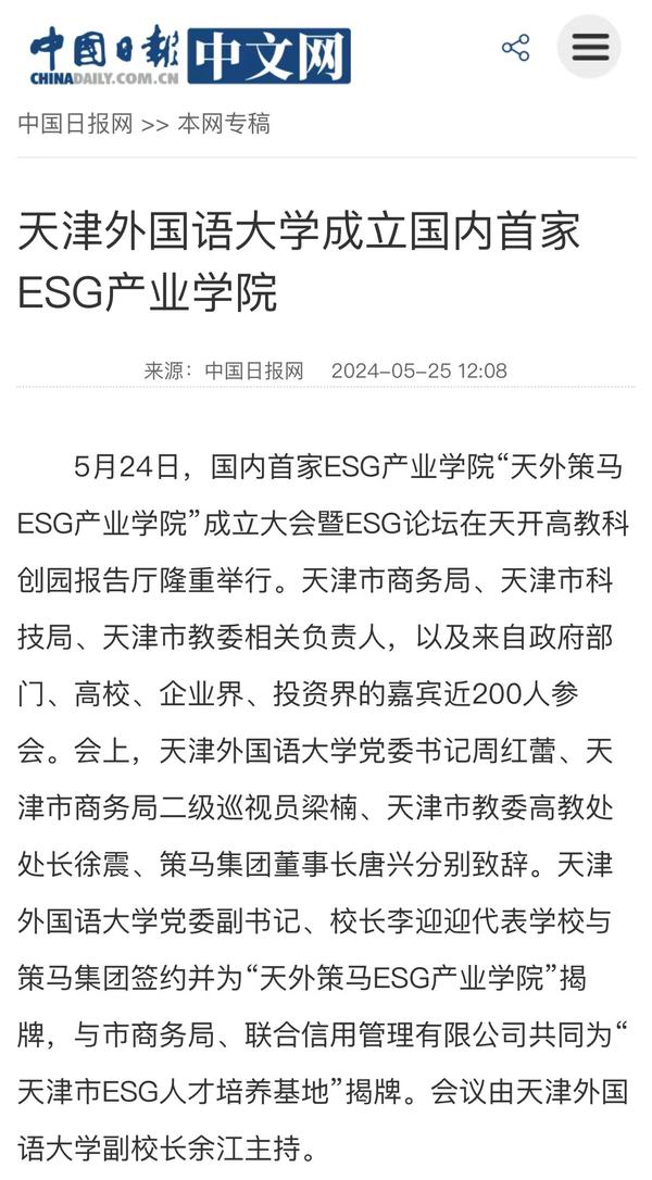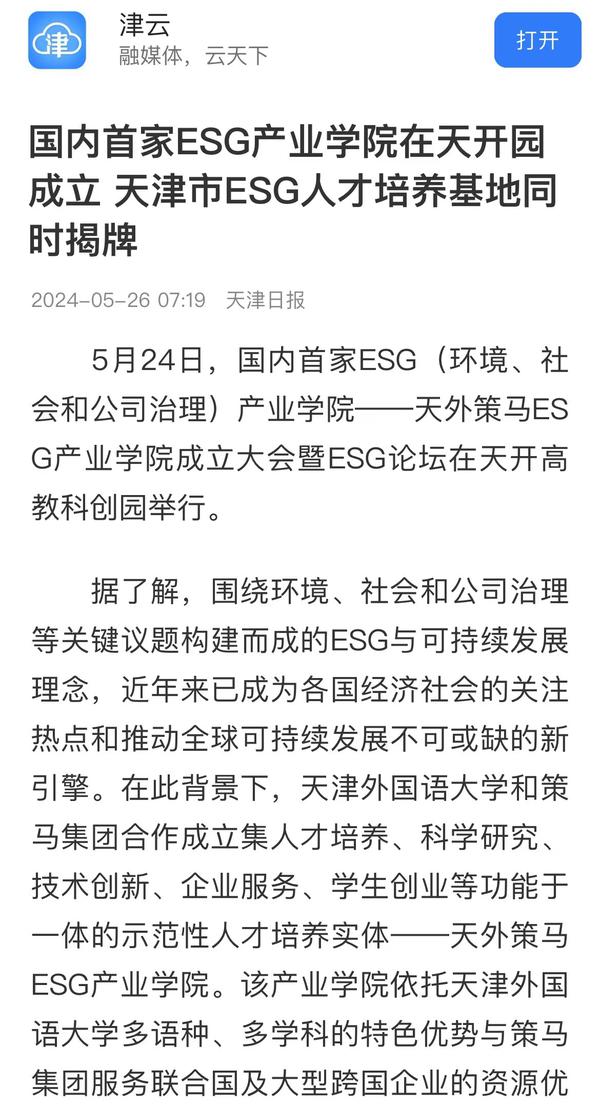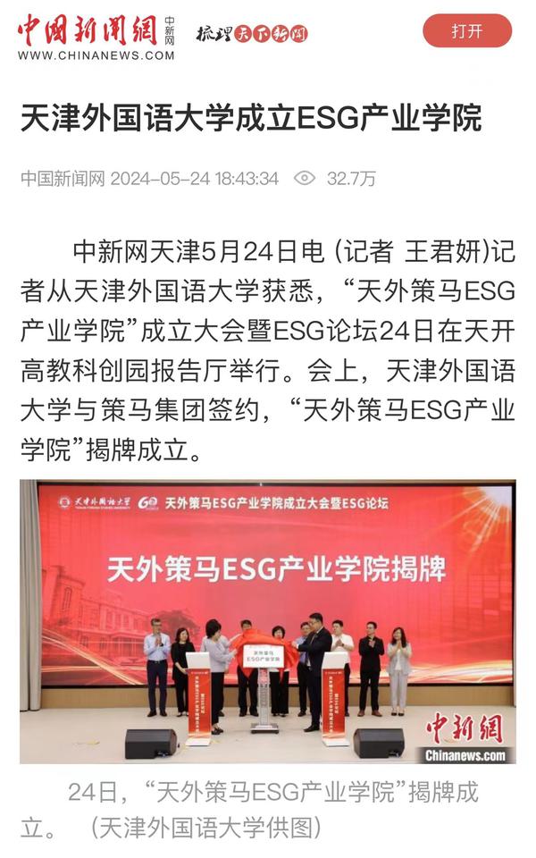 5月24日,国内首家ESG产业学院“天外策马ESG产业学院”成立大会暨ESG论坛在天开高教科创园报告厅隆重举行。该产业学院依托开云体育多语种多学科特色优势与策马集团服务联合国及大型跨国企业的资源优势,构建全方位、全链条、深融合的产学研用协同育人新机制,培养具有ESG知识与实务技能的跨学科、跨领域、复合型的国际化ESG人才。人民日报客户端、人民网、新华社客户端、光明日报客户端、光明日报微信公众号、中国新闻网、中国日报网、央广网、天津日报、津云、天津教育报、网易新闻、北青网等多家媒体对此进行了报道。