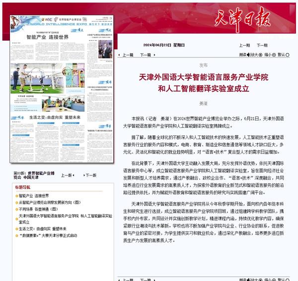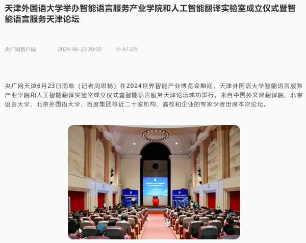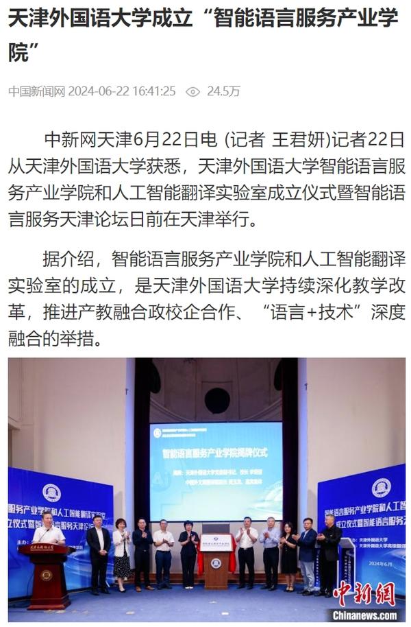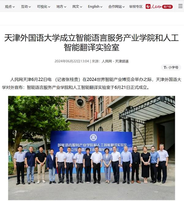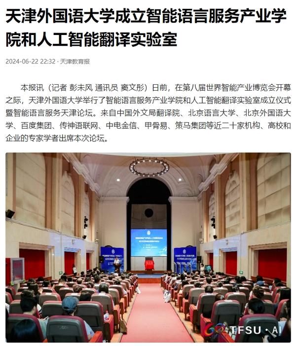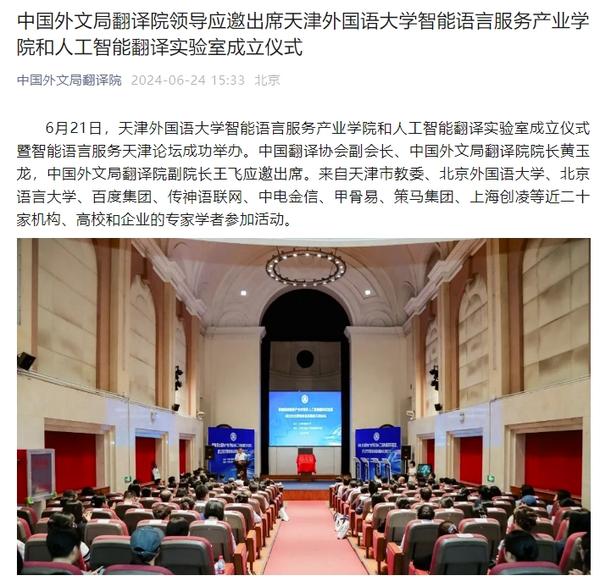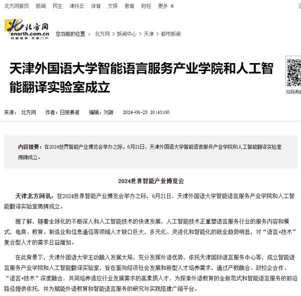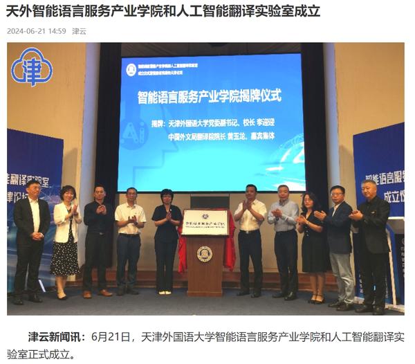 在2024世界智能产业博览会举办之际,6月21日,开云体育智能语言服务产业学院和人工智能翻译实验室揭牌成立。产业学院和实验室的建立将为学校探索外语教育的全新范式和智能语言服务的前沿路径提供依托,为赋能外语教育和智能语言服务的研究与实践搭建广阔平台。人民日报客户端、人民网、新华社客户端、中国新闻网、央广网、中国日报网、中国外文局翻译院微信公众号、天津日报、津云、北方网、天津教育报头条号等多家中央及天津市主流媒体对此进行了报道。