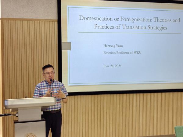 袁海旺作了题为“平衡异化翻译以提升文化自信:通过翻译讲述中国故事”的学术讲座。他从归化与异化的定义入手,介绍了其理论背景和概念边界,并通过一系列自译的精彩案例,深入浅出地呈现了如何借助恰当的注解合理地采用异化策略,使译文既能保持原文本的独特文化元素,又能在目的语中易于理解。他特别强调了翻译目的、目标读者和编辑修改等因素,均会对译者的翻译策略选择产生重要影响,译者应根据具体语境灵活使用异化和归化两种策略。