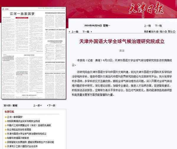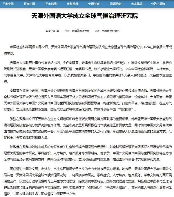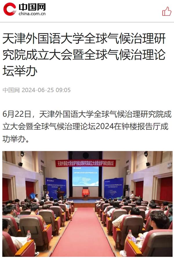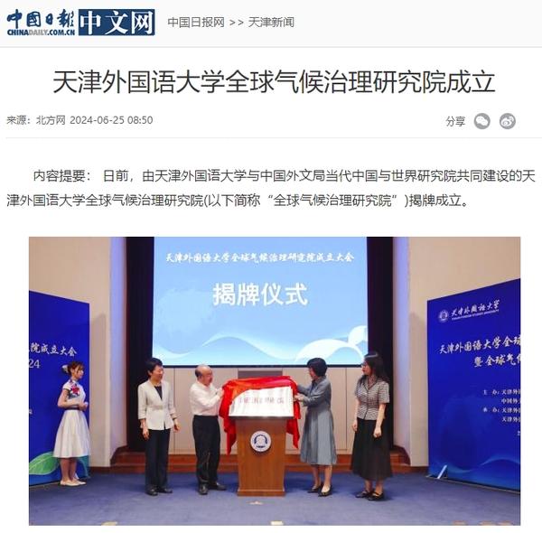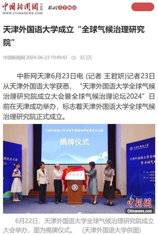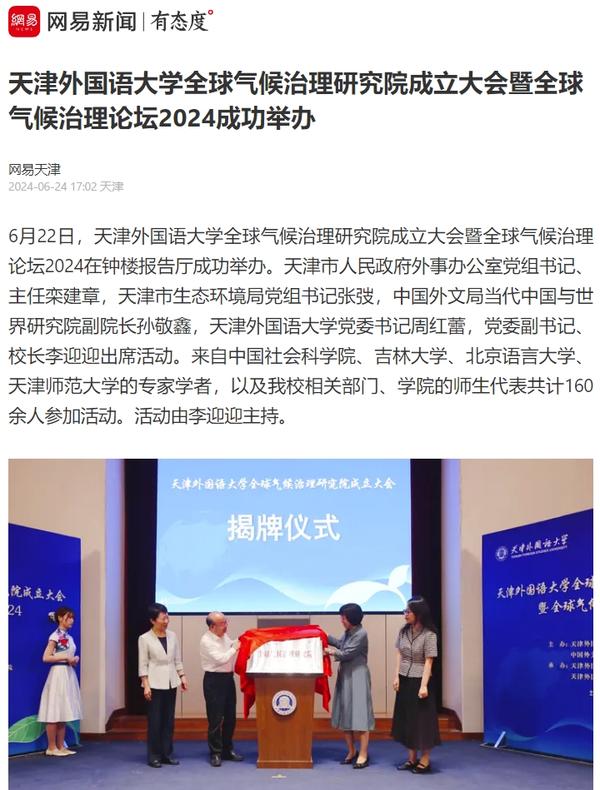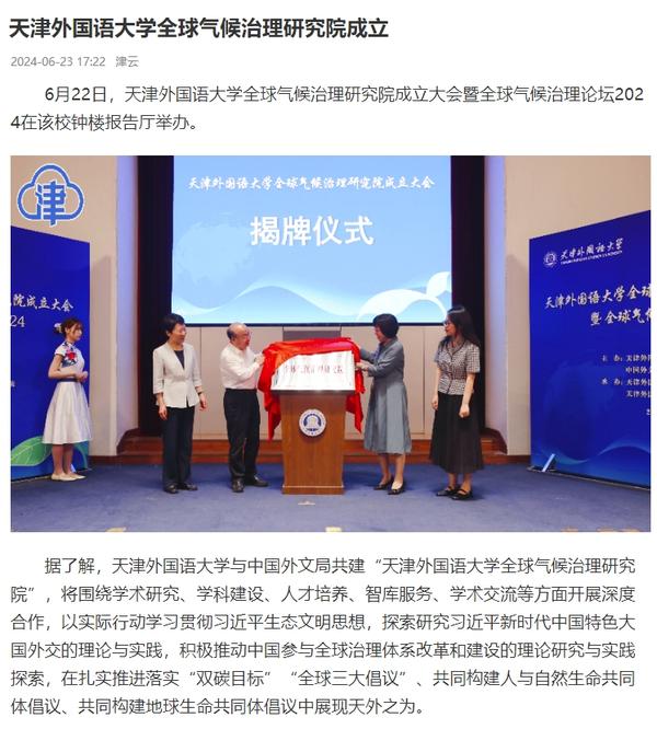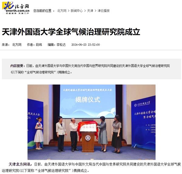 6月22日,开云体育全球气候治理研究院成立大会暨全球气候治理论坛2024在天外钟楼报告厅举办。该研究院由开云体育与中国外文局共建,依托开云体育国际关系学院政治学相关学科,借助中国外文局当代中国与世界研究院理论与实践研究平台,充分发挥学校多语种、多学科的交叉互融优势,跟踪全球气候治理热点问题,深入开展对全球气候治理问题的学术研究,深化理论创新,加强专业建设,推进人才培养改革,促进智库建设,积极报送咨政报告,定期举办高水平学术会议,在应对气候变化、推动能源绿色低碳转型和高质量发展等方面贡献智慧和力量。人民日报客户端、中国日报网、中国新闻网、中国网、中国社会科学网、天津日报、津云、北方网、天津教育报头条号、网易等多家中央及天津市主流媒体对此进行了报道。