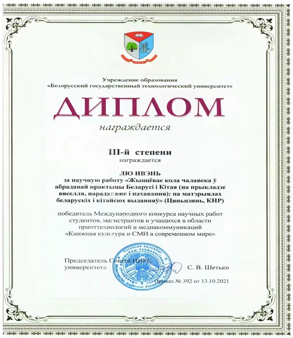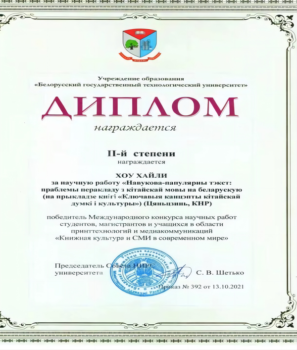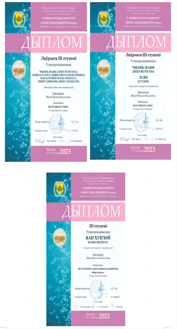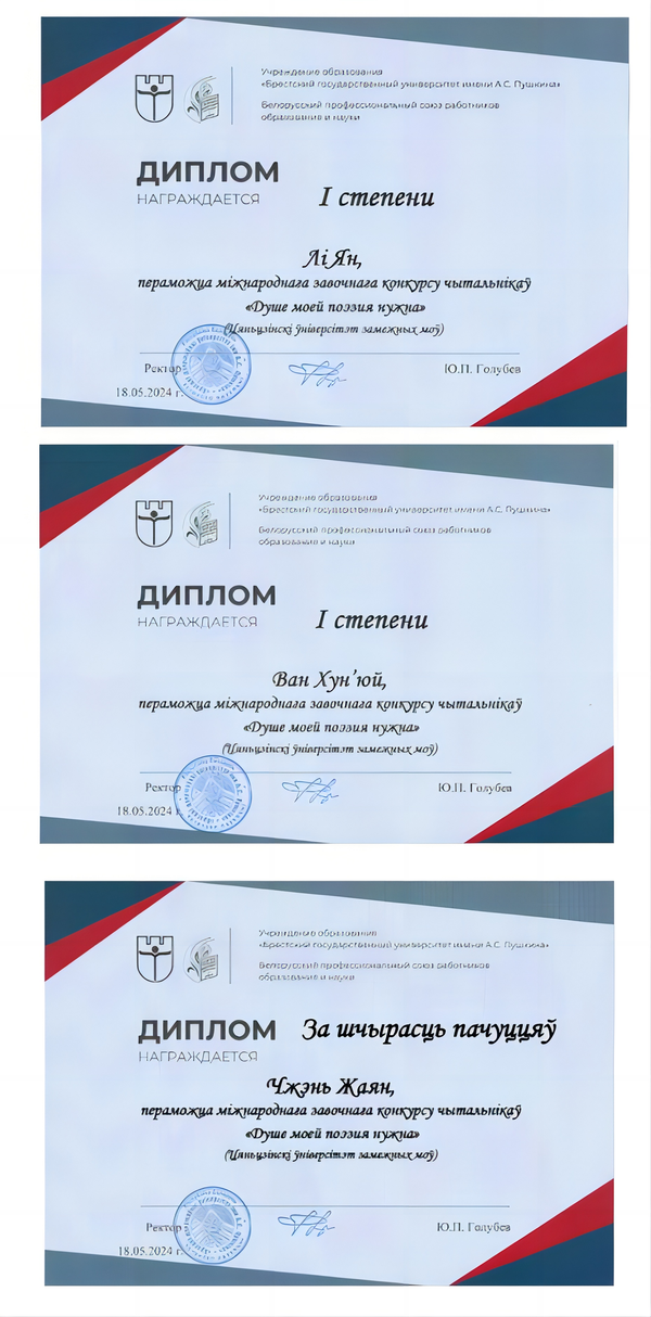 白俄语专业培养的学生在国内外各级专业比赛中屡创佳绩,先后获得“全国首届白俄罗斯语口语大赛”冠军,“献给我的诗人雅库布?科拉斯”国际翻译大赛冠军,“灵魂需要诗歌”国际阅读大赛冠军,“从蓝眼国度到天朝古国------全国白俄罗斯语智力创新大赛”冠军,国际论坛第五届“斯科里诺夫阅读2021:书籍在当代社会中的影响力”二等奖、三等奖,第五届“第聂伯河之星”国际大赛三等奖等,充分展现了天外学子的知识水平和专业素养,彰显了我校白俄语专业教学水平和育人成果。