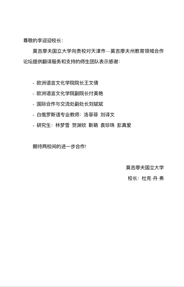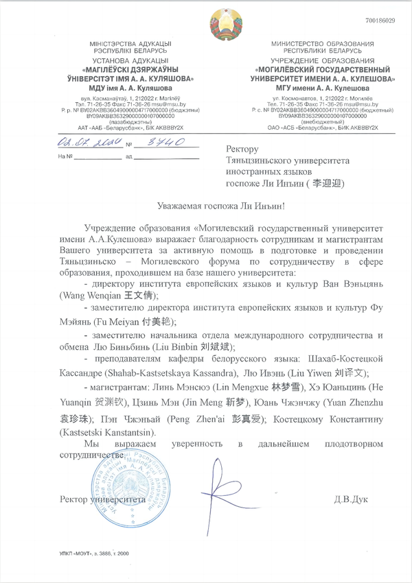 近日,开云体育收到白俄罗斯莫吉廖夫国立大学发来的两封感谢信,对学校领导带队出访并参加“天津市—莫吉廖夫州教育合作论坛”表示感谢,对天外师生团队在论坛筹备期间所提供的语言翻译服务给予高度肯定,同时期待双方在教育、科研、文化交流等领域进一步开展富有成效的合作。