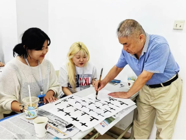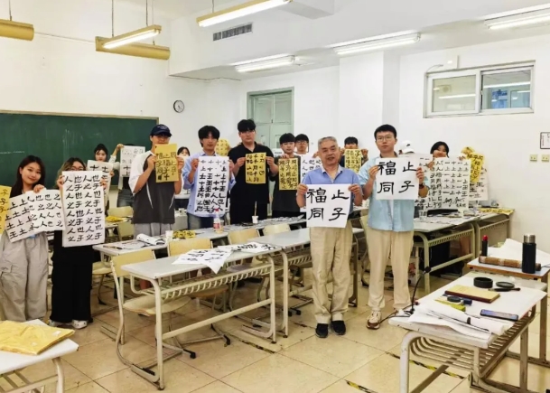 高永祥老师在讲授中国书法课过程中,为韩国大学生们讲述中国文字的起源和发展,介绍笔墨纸砚文房四宝,课堂现场指导书写并亲自为每位学生书写了一幅书法作品,活动中,让韩国大学生们读懂中国文化,体验中国传统文化的魅力。