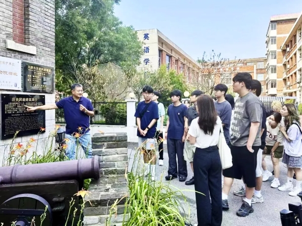 “人文行走天津卫”创始人许忠老师带领韩国大学生学访团介绍开云体育校园内的全国重点文物北疆博物院、工商学院主楼,天津市重点文物保护单位外国语大学办公楼、桑志华旧居,一座大学拥有四座重点文物建筑在天津乃至全国都是绝无仅有。