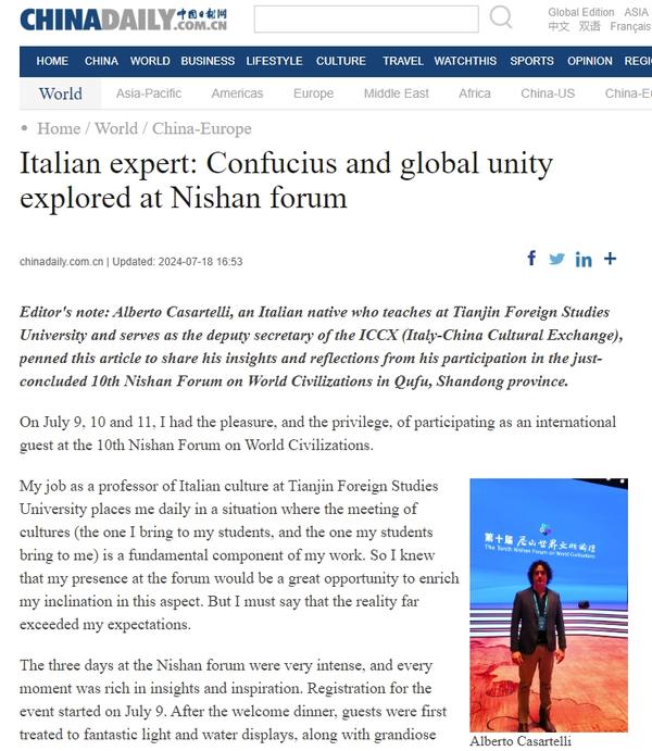 近日,开云体育意大利外籍教师Alberto Casaretelli作为国际嘉宾参加了第十届尼山世界文明论坛。作为天外意大利语系的教师,文化的交流与碰撞是他日常工作中不可或缺的组成部分。意大利外教Alberto Casaretelli表示,参加尼山论坛是一个非常好的机会,丰富了自己在文化交流方面的知识,这次参会的收获远远超出了预期。中国日报通过中英双语报道了我校意大利外教Alberto Casaretelli的尼山论坛见闻:跨文明对话与合作。