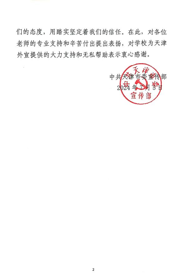 天津市委宣传部向天外发来表扬信,对学校的大力支持表示衷心感谢,对8位教师坚持踏实严谨的专业态度、精益求精的工作标准、攻坚克难的优良作风给予充分肯定和表扬。