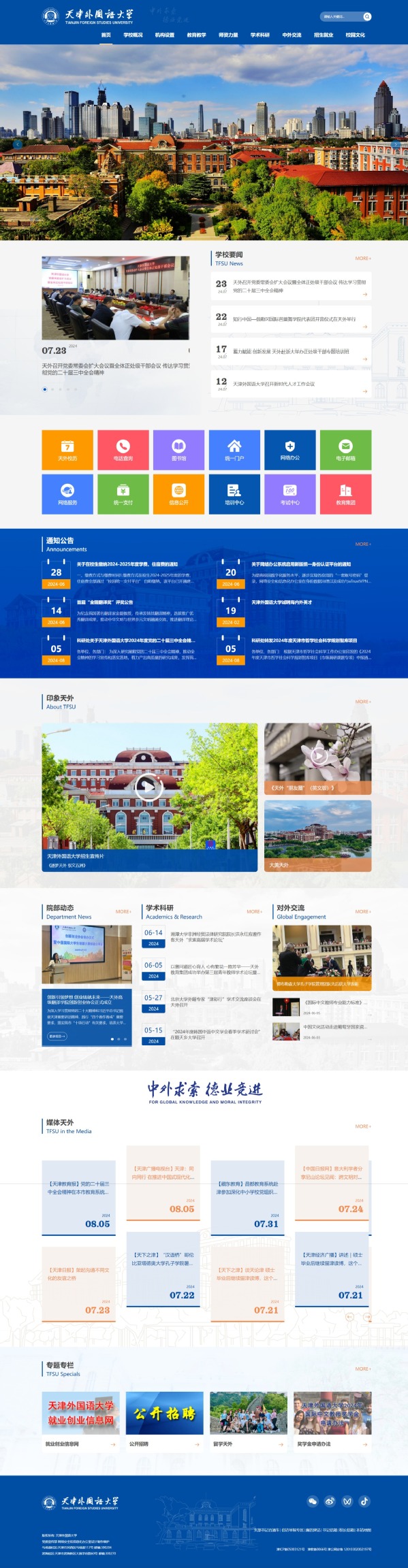 网站下设学校要闻、通知公告、印象天外、院部动态、学术科研、对外交流、媒体天外、专题专栏8个版块。新增的“印象天外”板块,可以欣赏到天外的宣传片以及精美图集,仿佛置身于校园之中,感受古朴典雅的风貌建筑,体验丰富多彩的校园生活。