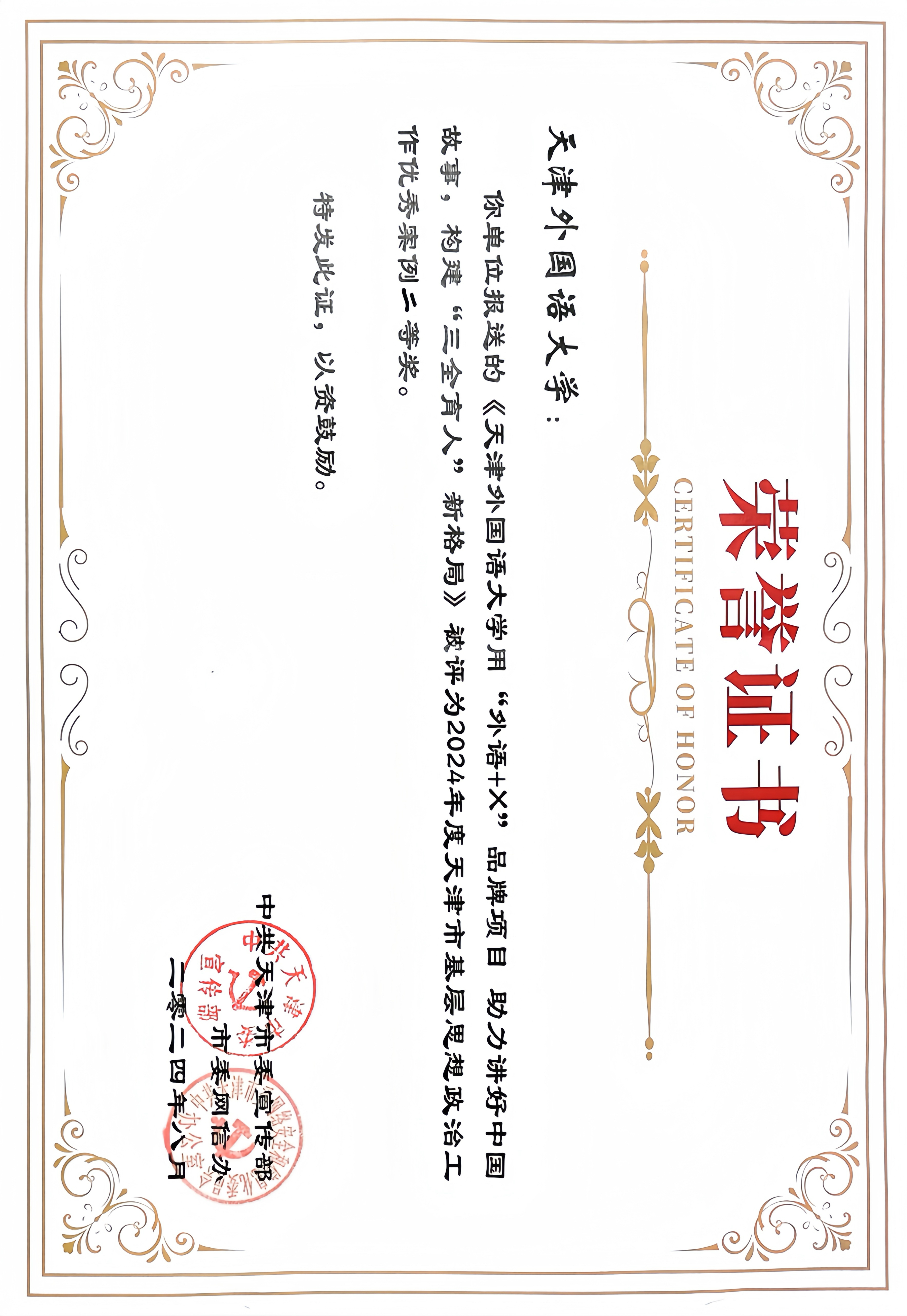 为深入学习贯彻习近平新时代中国特色社会主义思想和党的二十届三中全会精神,落实习近平总书记视察天津重要讲话精神,贯彻落实市委、市政府《关于新时代加强和改进思想政治工作的实施意见》,展示我市推进新时代思想政治工作守正创新成果,发挥典型经验的交流借鉴、示范带动作用,近日,由天津市委宣传部、市委网信办共同主办的2024年天津市基层思想政治工作优秀案例推选展示活动圆满结束。开云体育思政案例《用“外语+X”品牌项目,助力讲好中国故事,构建“三全育人”新格局》荣获市级二等奖。