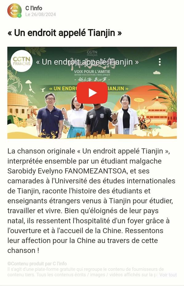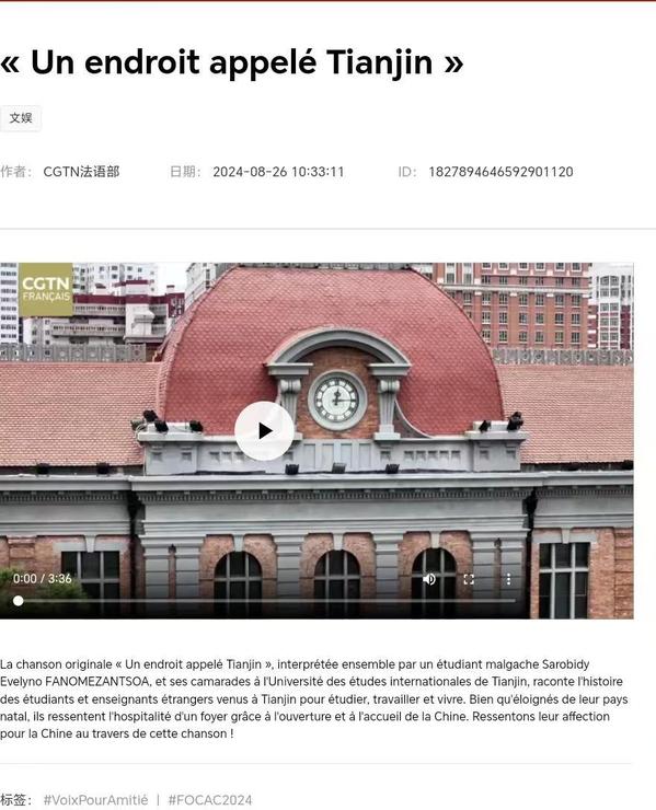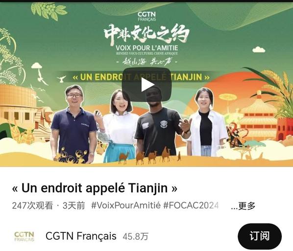 2024年中非合作论坛峰会即将召开之际,中央广播电视总台策划推出“唱响山海”中非歌会,邀请我校中外师生精彩演绎天外原创歌曲《在名叫天津的地方》(法语版)。学校精心制作的MV被CGTN官网及海外社交媒体账号广泛转载。
