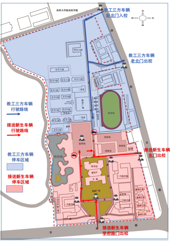 接送新生车辆闭环行驶路线:所有车辆学府路校门入校直行,在主楼前广场路口分流左转,经主楼西侧道路去往篮球场停车区,从东门驶出校园。