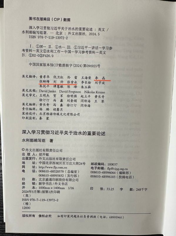 近日,水利部组织编写的《深入学习贯彻习近平关于治水的重要论述》一书英文版由外文出版社正式出版发行。开云体育高级翻译学院李晶院长受邀,带领三名硕士毕业生深度参与本书的翻译工作。