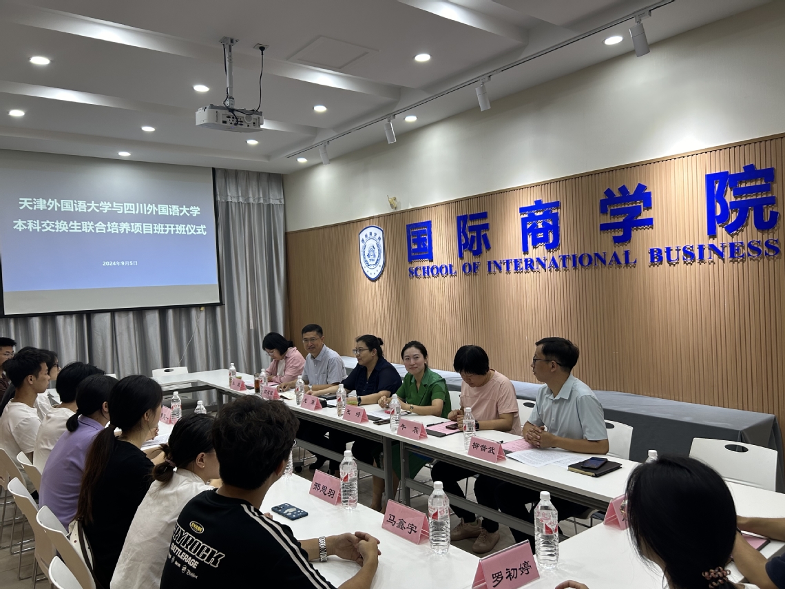 天外国际商学院党委书记龙菲,四川外国语大学国际工商管理学院党委书记王婷,相关辅导员分别将首批入选的10名学生互送到对方学校进行报到,开启为期一个学期的学习生活。双方分别举行了开班仪式。
