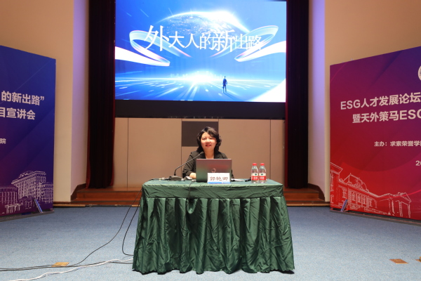 天外策马ESG产业学院理事会成员、策马集团董事郭艳卿,ESG中心主任、前普华永道ESG披露和管理咨询业务顾问卿嘉惠,分别作主题报告。报告结合ESG事业的发展现状与未来趋势,展示了ESG事业与外语专业的结合点,引导外语人了解ESG事业,拓宽就业思路和视野,鼓励外语人将可迁移技能应用于ESG领域,实现个人发展与社会贡献的双重提升。