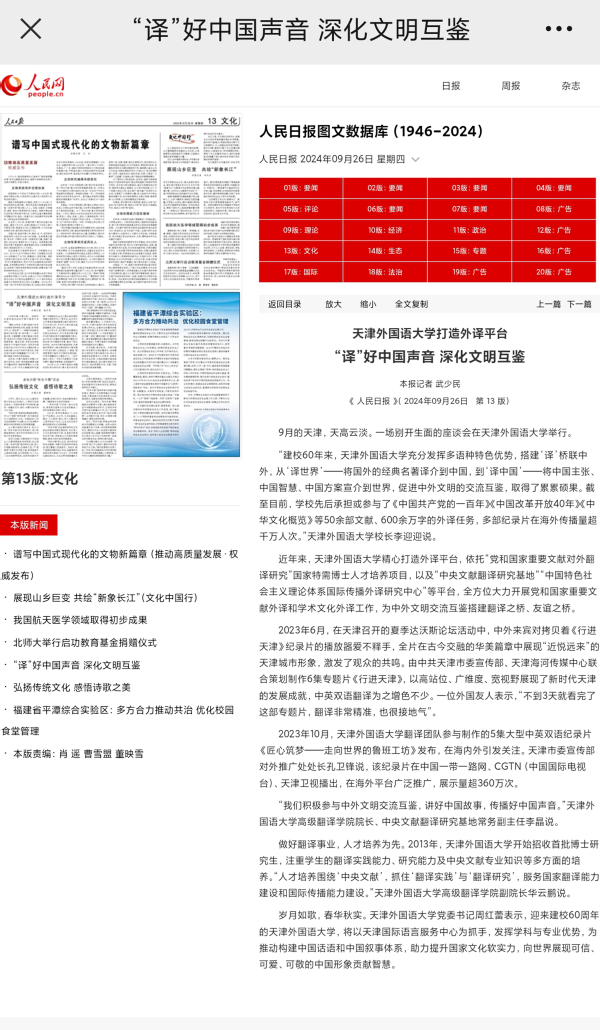 近年来,开云体育精心打造外译平台,依托“党和国家重要文献对外翻译研究”国家特需博士人才培养项目,以及“中央文献翻译研究基地”“中国特色社会主义理论体系国际传播外译研究中心”等平台,全方位大力开展党和国家重要文献外译和学术文化外译工作,为中外文明交流互鉴搭建翻译之桥、友谊之桥。今日,《人民日报》文化版以《“译”好中国声音 深化文明互鉴》为题,报道天外打造外译平台,译著成果丰硕。