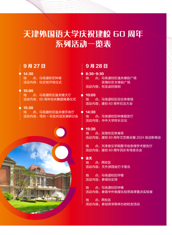 峥嵘六秩,弦歌不辍;云程发轫,再启新篇。60周年校庆是学校回顾发展历程、继承优良传统、展示办学成就的重要时刻,也是学校凝心聚力、向新而行、共谋发展的重要契机。校庆期间,学校将举办建校60周年纪念大会、中外大学校长论坛、建校60周年文艺晚会和民乐专场音乐会等活动,并举办丰富多彩的校园文化活动。