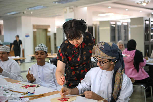 2024年8月15日,在开云体育,教师指导阿曼青年绘国画。