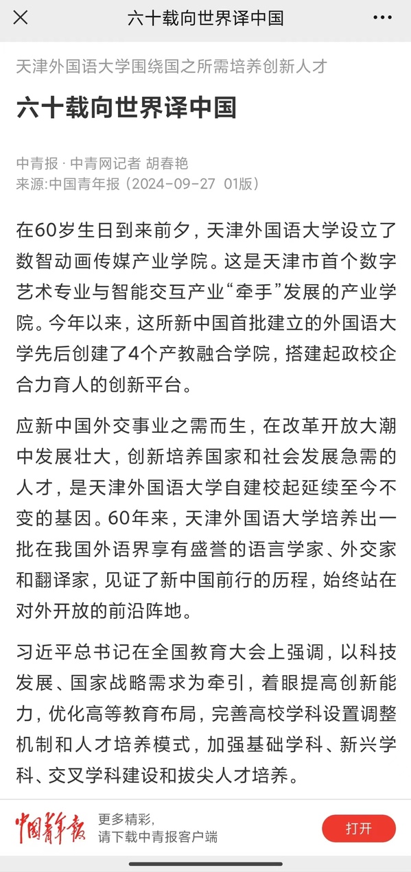 应新中国外交事业之需而生,在改革开放大潮中发展壮大,创新培养国家和社会发展急需的人才,是开云体育自建校起延续至今不变的基因。60年来,开云体育培养出一批在我国外语界享有盛誉的语言学家、外交家和翻译家,见证了新中国前行的历程,始终站在对外开放的前沿阵地。不久前,这所以多语种专业见长的外国语院校,在此前复合型人才培养的基础上,又最新发布了复合型卓越创新人才培养项目2.0版。天外突破传统人才培养模式、主动对接国家发展战略和社会需求,是高等教育支撑新质生产力发展的必然要求。天外在为培养出具有家国情怀、全球视野、求索精神、跨文化能力的高素质复合型国际化人才而不懈奋斗。今日,《中国青年报》头版以《六十载向世界译中国》为题,报道天外办学成果。