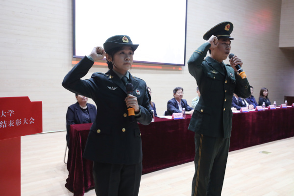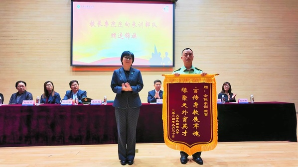 周红蕾和李迎迎代表学校向承训部队赠送了锦旗,希望双方继续保持密切联系,进一步加强军校合作,同时向为本次军训工作付出辛勤努力的全体承训教官及跟训教师表示衷心感谢,对军训工作取得的成果给予了充分肯定。