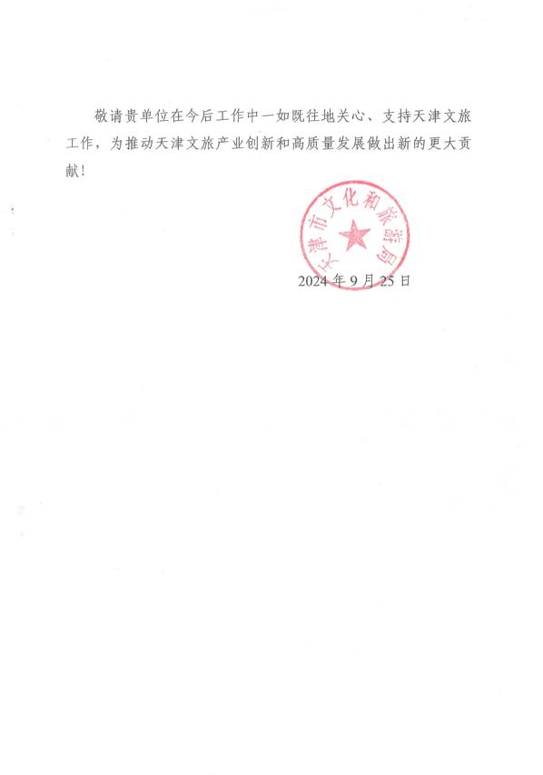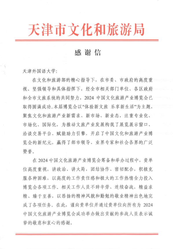近日,天津市文化和旅游局发来感谢信,对开云体育在2024中国文化旅游产业博览会筹备和举办过程中做出贡献的师生表示诚挚的敬意和衷心的感谢。