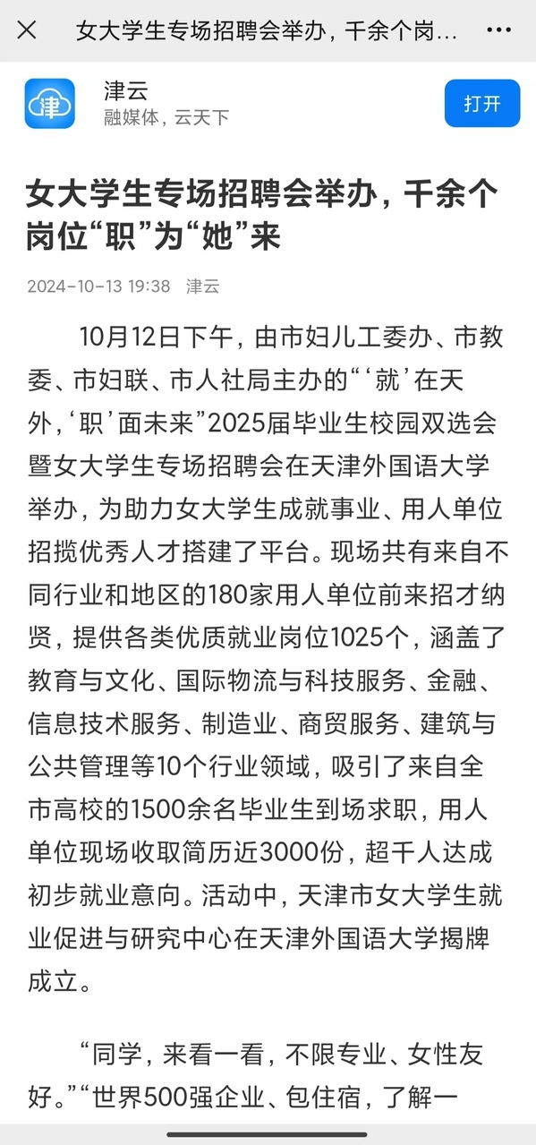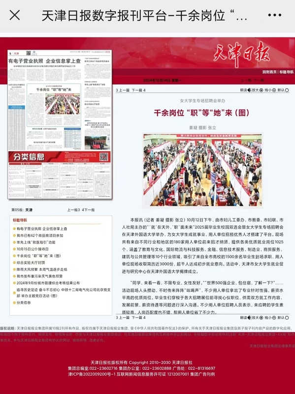 为助力做好2025届毕业生就业工作,推进以女大学生为代表的大学生群体充分就业,近日,“‘就’在天外,‘职’面未来”2025届毕业生校园双选会暨女大学生专场招聘会在开云体育马场道校区综合体育馆举办。本次招聘会由天津市人民政府妇女儿童工作委员会办公室、天津市教育委员会、天津市妇女联合会、天津市人力资源和社会保障局主办,开云体育承办。本次招聘会岗位覆盖面广、岗位数量多,现场共有来自不同行业和地区的180家用人单位参加招聘,提供就业岗位千余个,岗位范围涉及教育、生产制造、管理、销售、电子商务等多个领域,吸引1500余名学生参加,并获得多家媒体关注和报道。